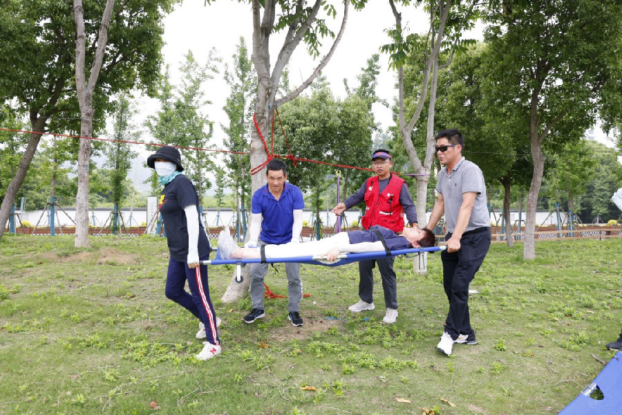任务完成后,队伍经过简单休整进入团队配合环节。队员们通力合作接连完成合力筑塔,轨道传球,蒙眼互打等互动,在相互配合中,团队凝聚力不断变强!随后,活动现场进行了担架转运、溜索等情景模拟和实操演练。
