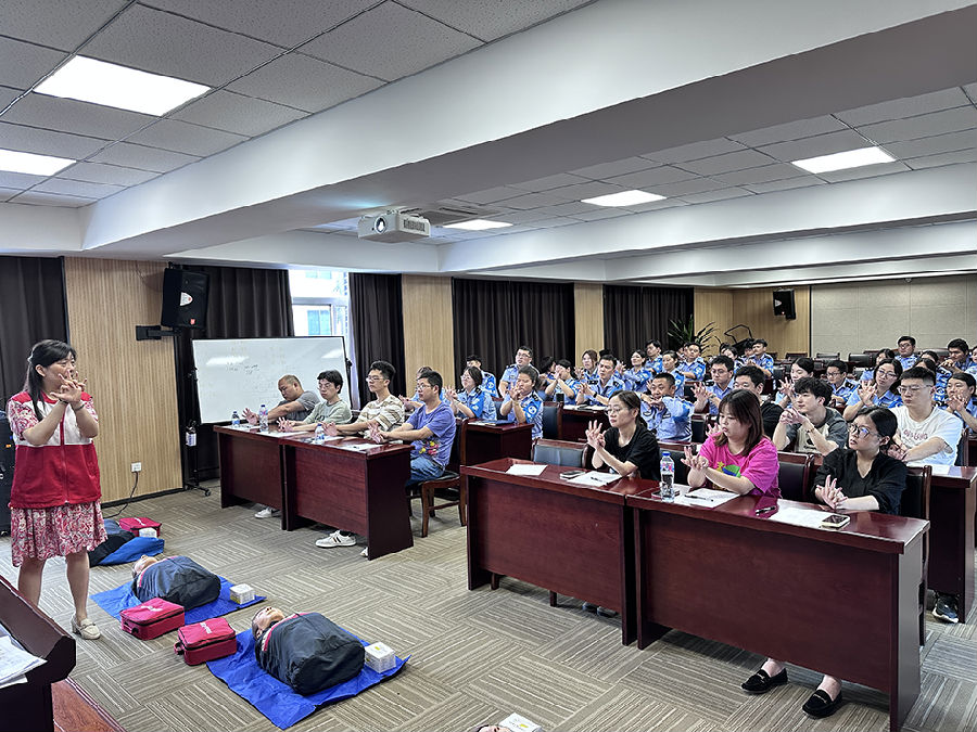 培训现场,红十字会救护讲师陆明钰通过理论讲解、指导示范等方式为大家讲解了心肺复苏、人工呼吸、海姆立克法、AED使用以及气道异物梗阻急救等理论知识,并进行了示范演练。培训着重介绍了心肺复苏的操作要领,强调“黄金四分钟”的重要性,并对判断是否丧失意识、有无自主呼吸等进行详细讲解。
