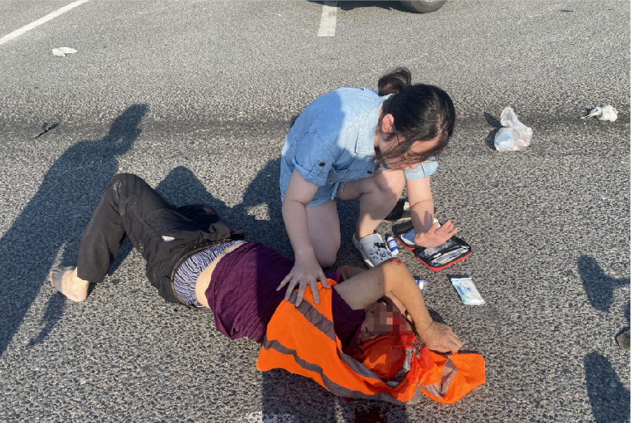 下午四点,经过太阳暴晒的路面像“烤箱”,钟蝶不顾地面的高温,单膝跪在伤者身旁,“老爷子,能听到我说话吗?我是医务人员,我是来帮你的,来,试着握紧我的手。”她边说边测量起了老人脉搏,观察脸色情况和头部出血情况。丈夫唐国盛随即取出急救包中的纱布和绷带,两人合力将老人头部伤口先行加压包扎止血,并逐步检查老人四肢,胸腹等处,探查是否有其他的外伤及骨折。