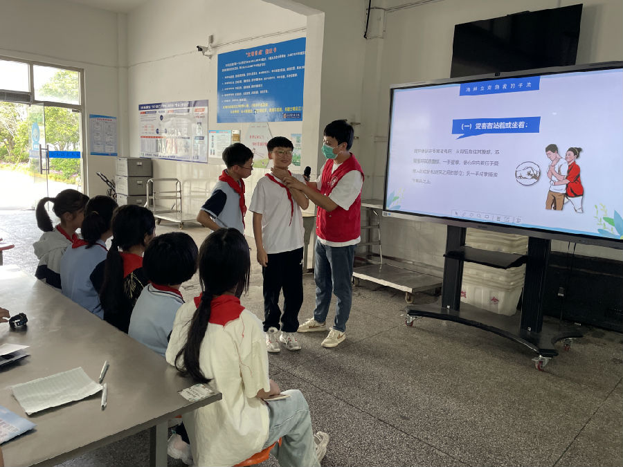 近日,吴江区七都镇红十字会组织开展应急救护进校园活动,邀请区红十字志愿者汤益飞来到江村实验学校(小学部),为六年级学生科普海姆立克急救法和溺水救治等急救技能。