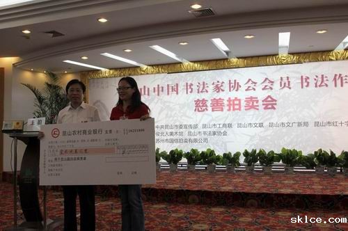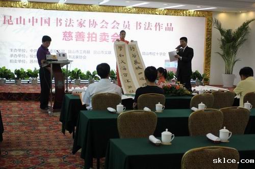 9月27日下午,昆山市委宣传部、市红十字会、市书法家协会等单位联合举办的第三届昆山中国书协会员书法作品展暨慈善拍卖会在昆山宾馆举行,拍卖会成功拍出61幅书法作品,拍卖所得19万元当场捐赠给昆山市红十字会,用于救助昆山白血病患者。