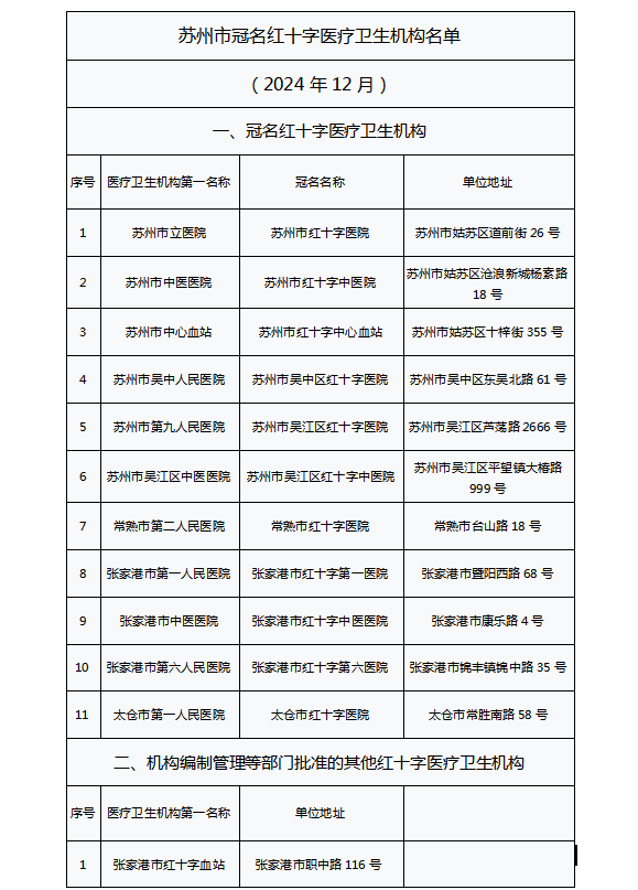 根据《中华人民共和国红十字会法》《中华人民共和国红十字标志使用办法》《关于医疗机构冠名红十字(会)的规定》《红十字医疗卫生机构管理办法》有关要求,现对苏州市冠名红十字医疗卫生机构的相关信息进行公示。